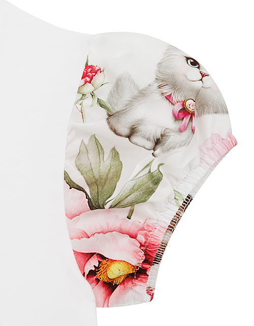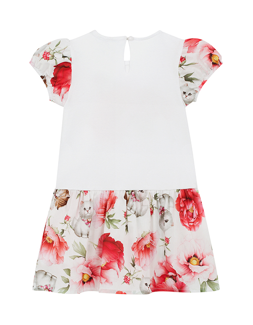 Хорошенькое платьице превратит Вашу дочку в самую очаровательную принцессу! Особое очарование модели придаёт цветочный принт с котятами, воздушные складочки на юбке и оборки на рукавах. Приятный материал и комфортный силуэт позволят носить наряд весь день