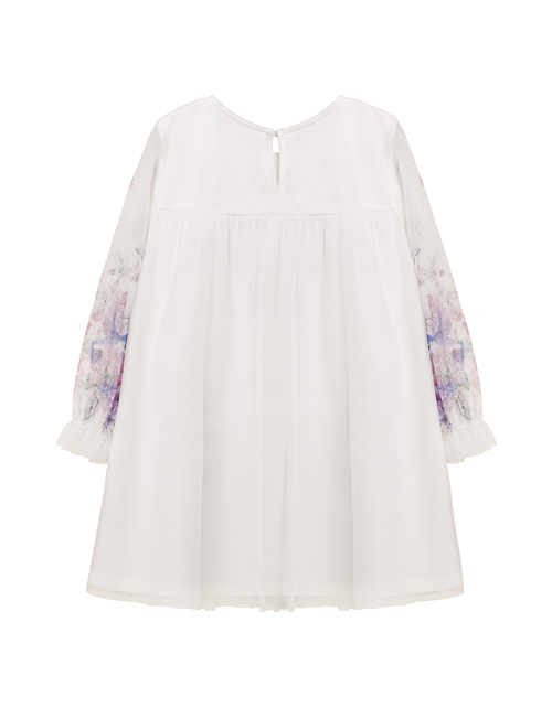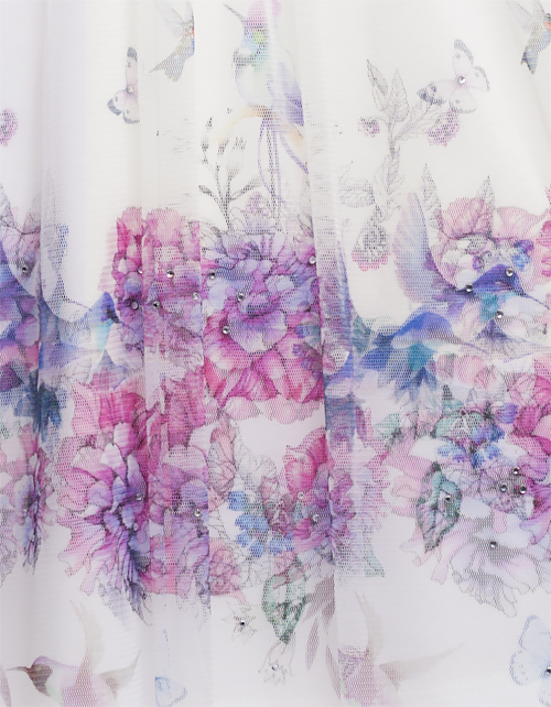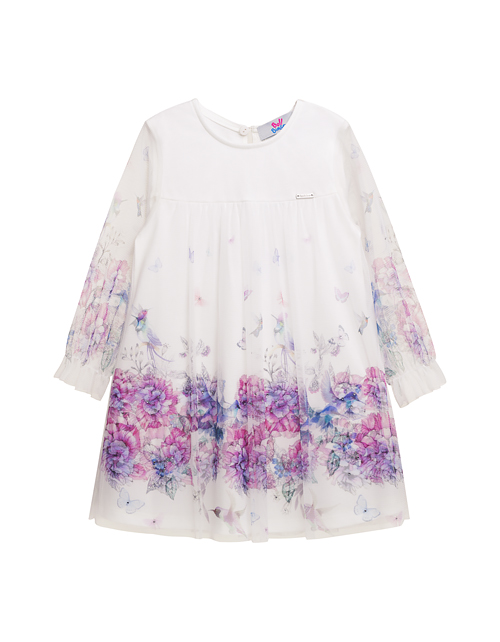 Воздушное романтичное платье для маленькой феи. Парящий эффект невесомой сеточки, нежный цветочный рисунок с птичками, переливающиеся стразы и изящные рюшечки на рукавах создают настроение легкости и праздника.