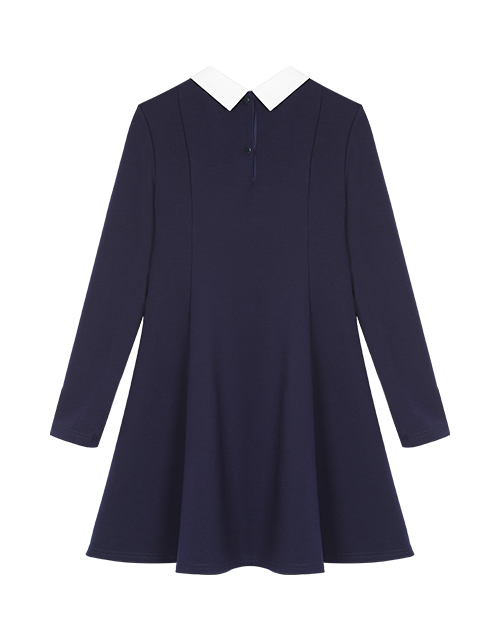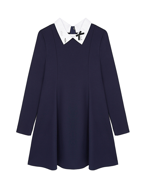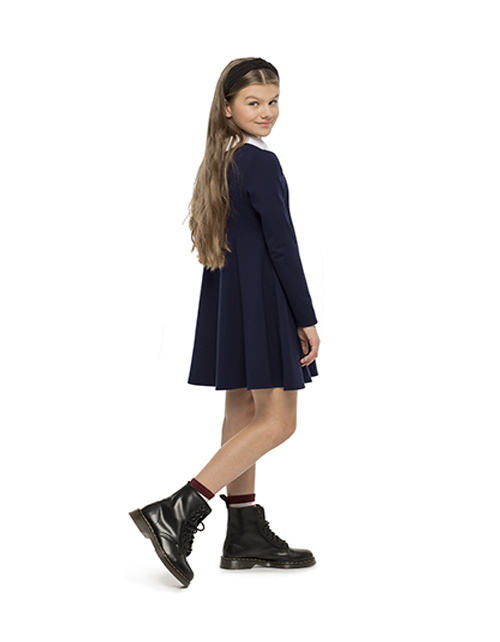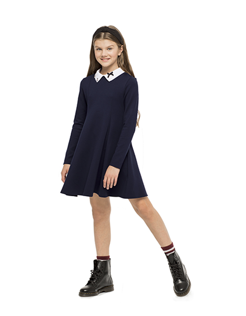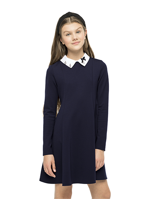 Изящное платье для девочки из джерси - синтез красоты и комфорта. Мягкий А-силуэт придаёт образу изящность, а белый отстегивающийся воротник с элегантным декором подвесками, делает платье превосходным повседневным вариантом.