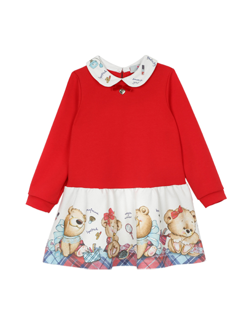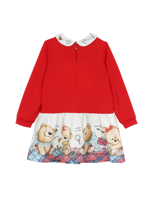 Красное платье для девочки свободного силуэта имеет отрезную заниженную талию, а юбка и воротничок выполнены из контрастной ткани с рисунком мишками. Сзади есть застежка на молнии, а на рукавах удобные манжеты. Изделие пошито из приятного к телу футера.