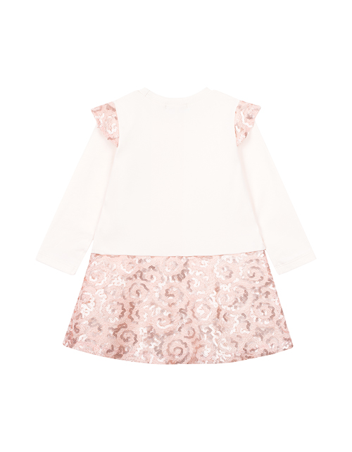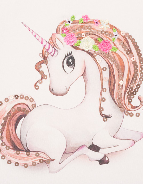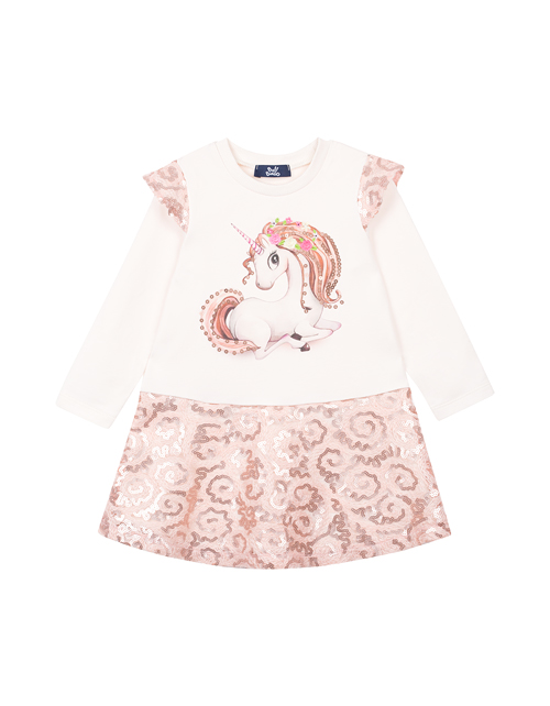 Нарядное платье для девочки с единорогом имеет круглый вырез горловины, отрезную заниженную талию и крылышки на рукавах в тон юбке. Юбка и крылышки платья дополнены блестящим сетчатым полотном. У платья есть подклад из трикотажной ткани кулирная гладь.