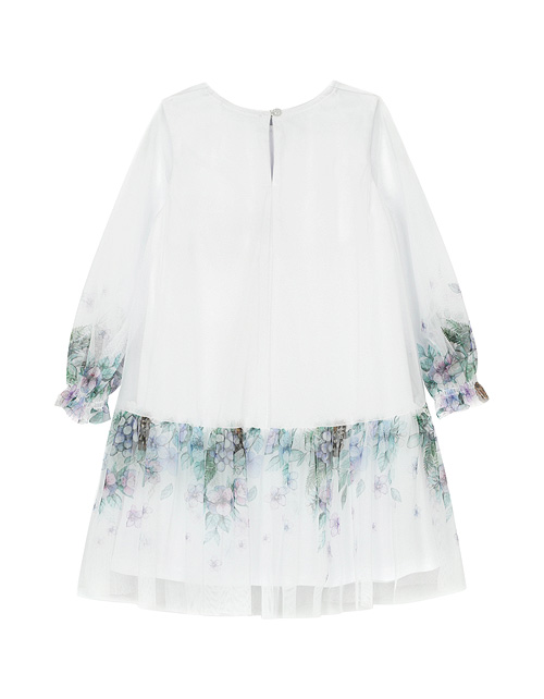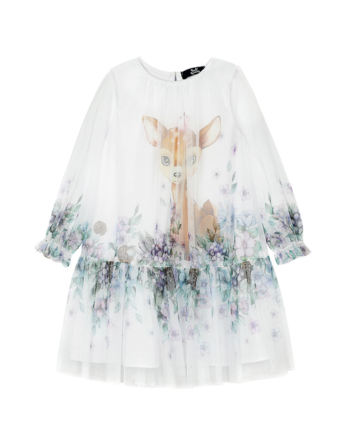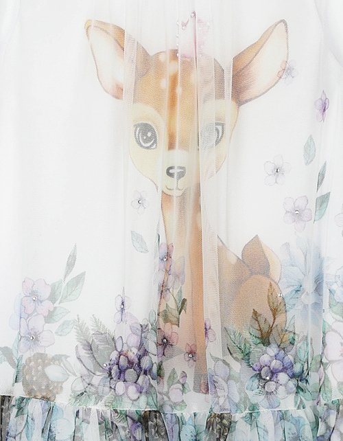 Нарядное платье для девочки свободного силуэта имеет круглый вырез горловины, сборки на рукавах и заниженную линию талии. Сетчатое полотно декорировано нежнейшим цветочным рисунком с олененком. Изделие имеет трикотажную подкладку для удобства в носке.