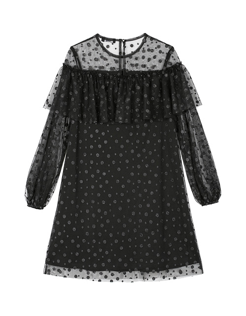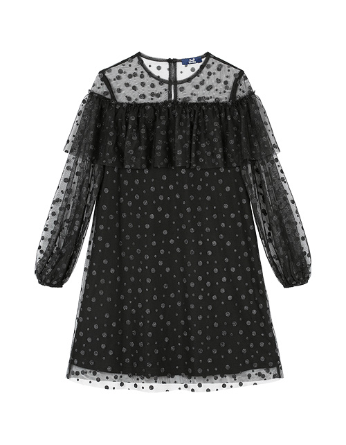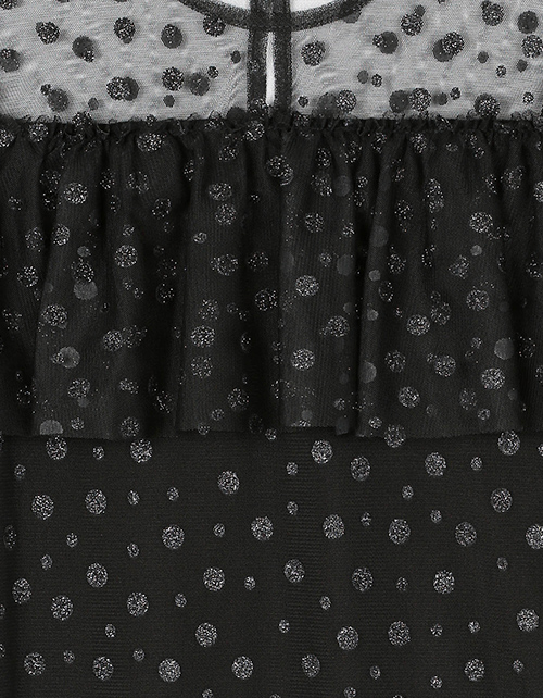 Нарядное платье для девочки а-силуэта с круглым вырезом горловины дополнено манжетами на рукавах и широкой оборкой на груди. Сетчатое полотно придает изделию невесомый вид, а подкладка из ткани кулирная гладь гарантирует приятные тактильные ощущения.