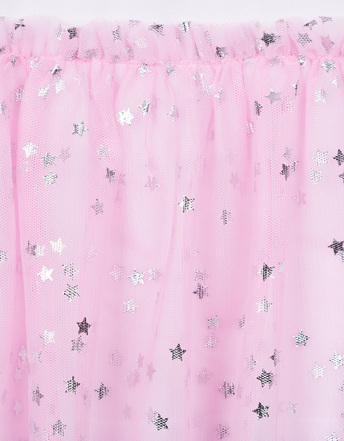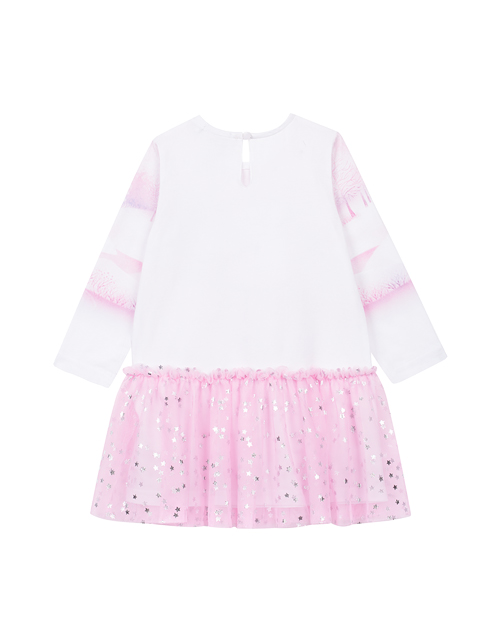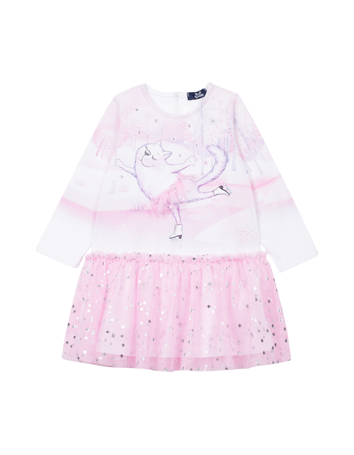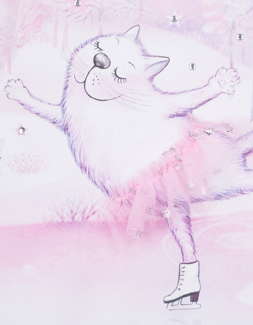Нарядное трикотажное платье для девочки дополнено нежным принтом с кошкой на коньках с отлетным элементом. Изделие имеет свободный силуэт, длинный рукав,отрезную заниженную талию и круглый вырез горловины. Юбка отделана сетчатым полотном с пайетками.