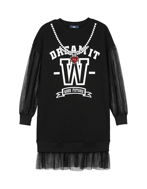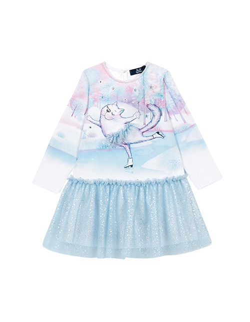 Нарядное трикотажное платье для девочки дополнено нежным принтом с кошкой на коньках с отлетным элементом. Изделие имеет свободный силуэт, длинный рукав,отрезную заниженную талию и круглый вырез горловины. Юбка отделана сетчатым полотном с пайетками.
