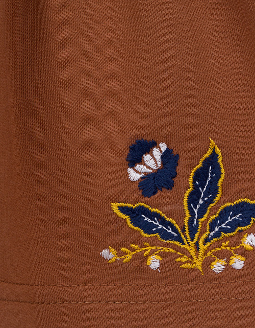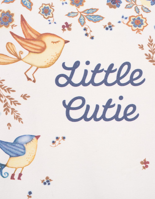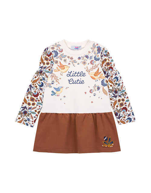 Платье для девочки с юбкой дополнено растительным принтом с птичками, стильной надписью и вышивкой на юбке. Изделие имеет длинный рукав, заниженную отрезную талию и круглый вырез горловины. Ткань футер дарит повышенный комфорт и удобство в носке.