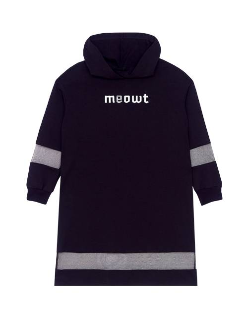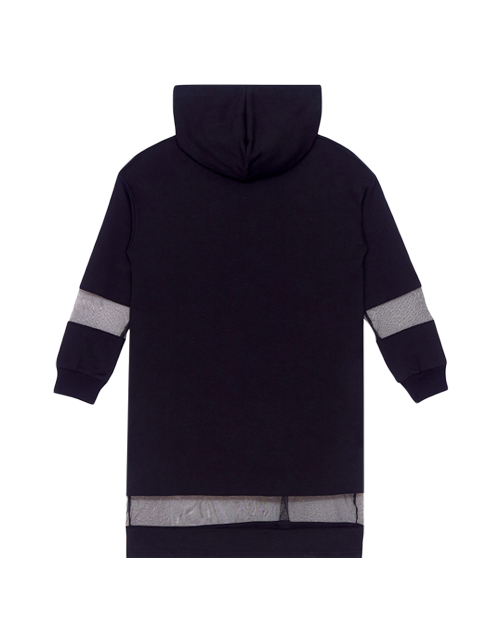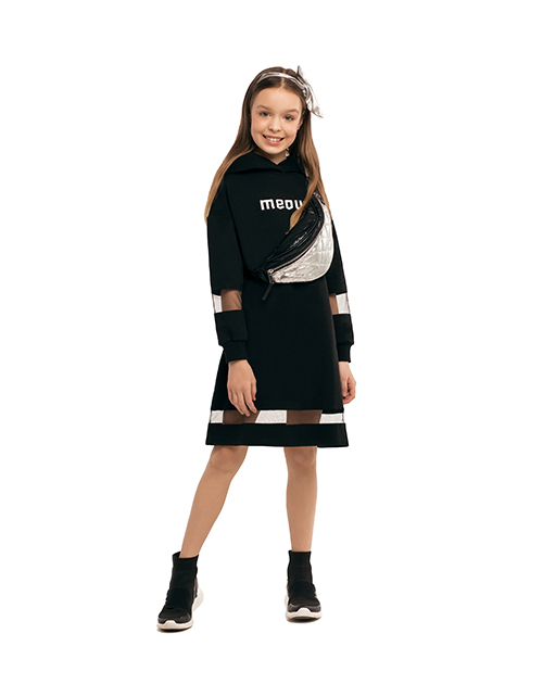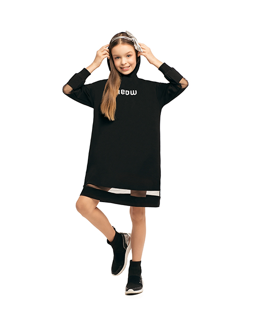 Черное платье для девочки с длинным рукавом и капюшоном. Декоративные вставки из сетчатого полотна. Рукава из рибаны. Принт-надпись в стилистике капсулы "Кот-Арт".