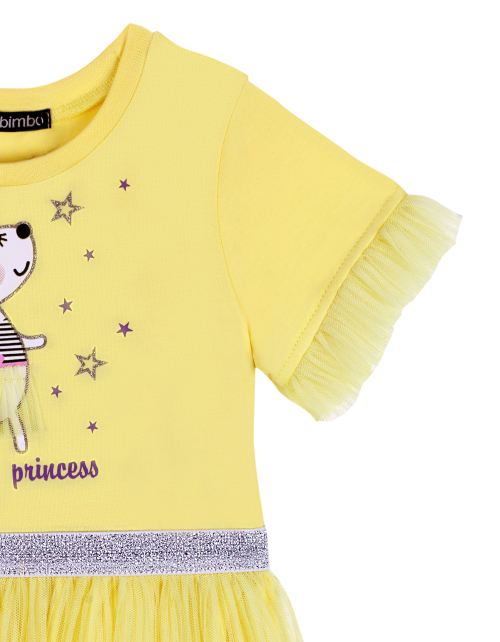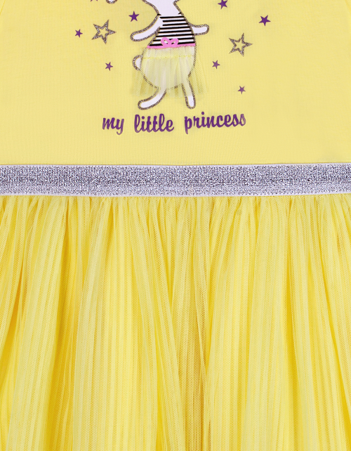 Светло-желтое платье для девочки трапециевидного силуэта. Короткий рукав и круглый вырез горловины. Юбка и рукава из сетчатого полотна со сборками. Верх и низ изделия соединены мягкой люрексовой лентой. Дизайнерское оформление в стилистике капсулы "Event