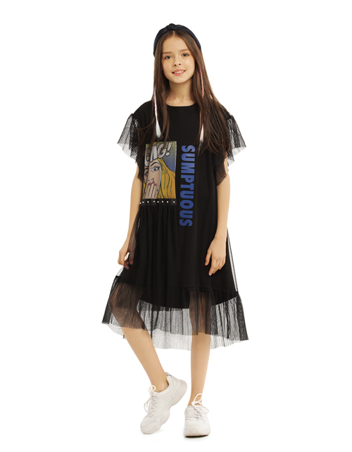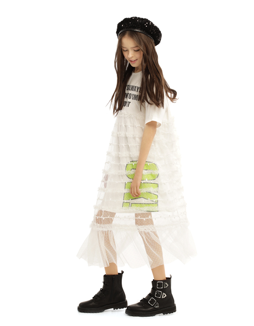 Молочное платье трапециевидного силуэта с завышенной талией. Застежка на пуговицу на спинке. Юбка из сетчатого полотна с использованием страз. Оформление в стилистике капсулы "Event".