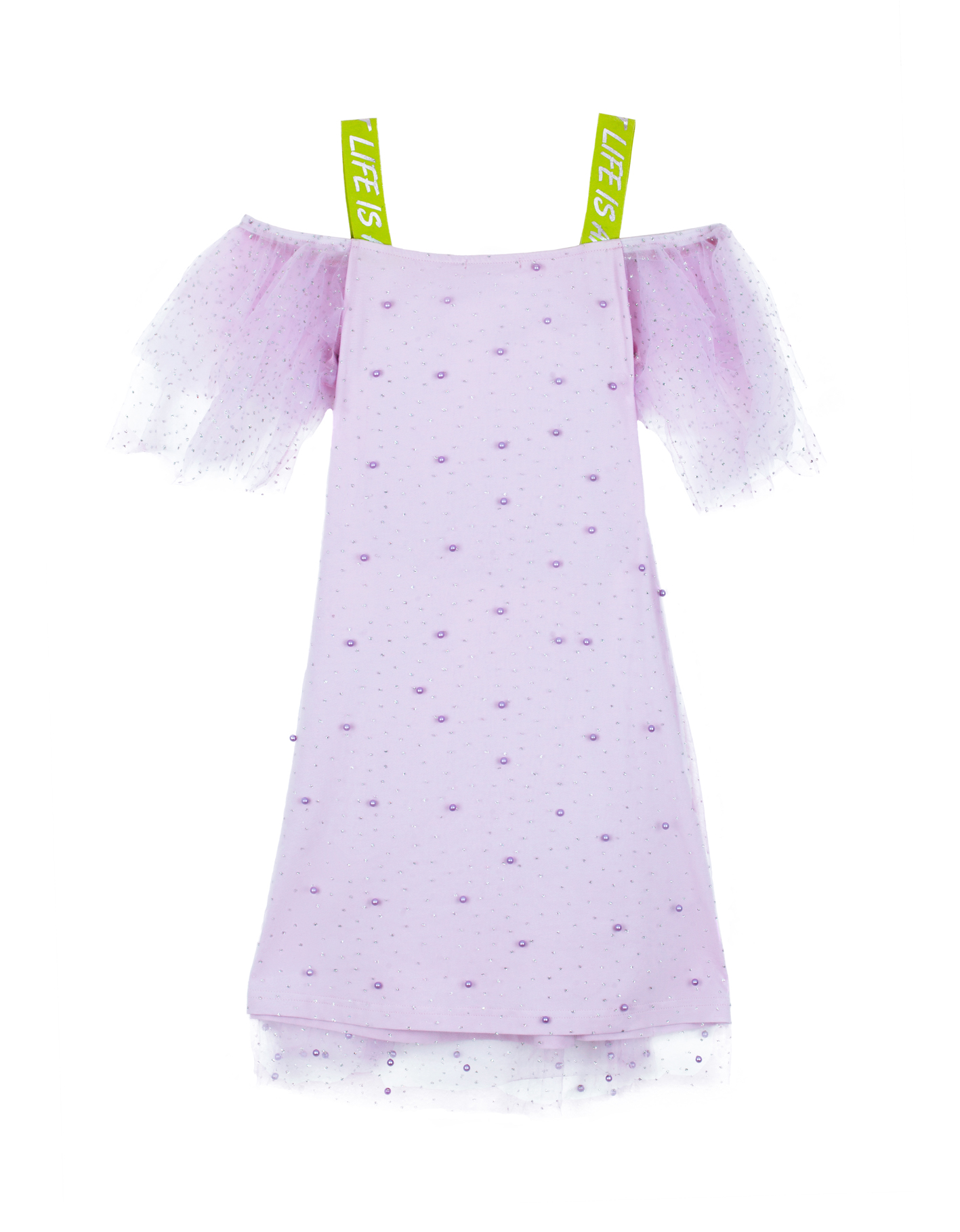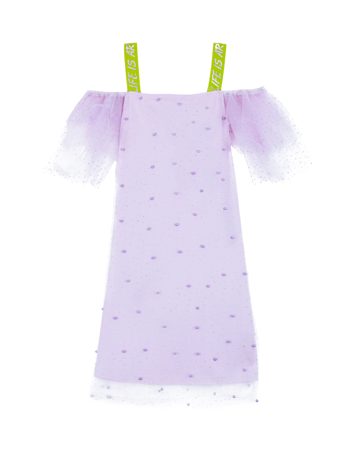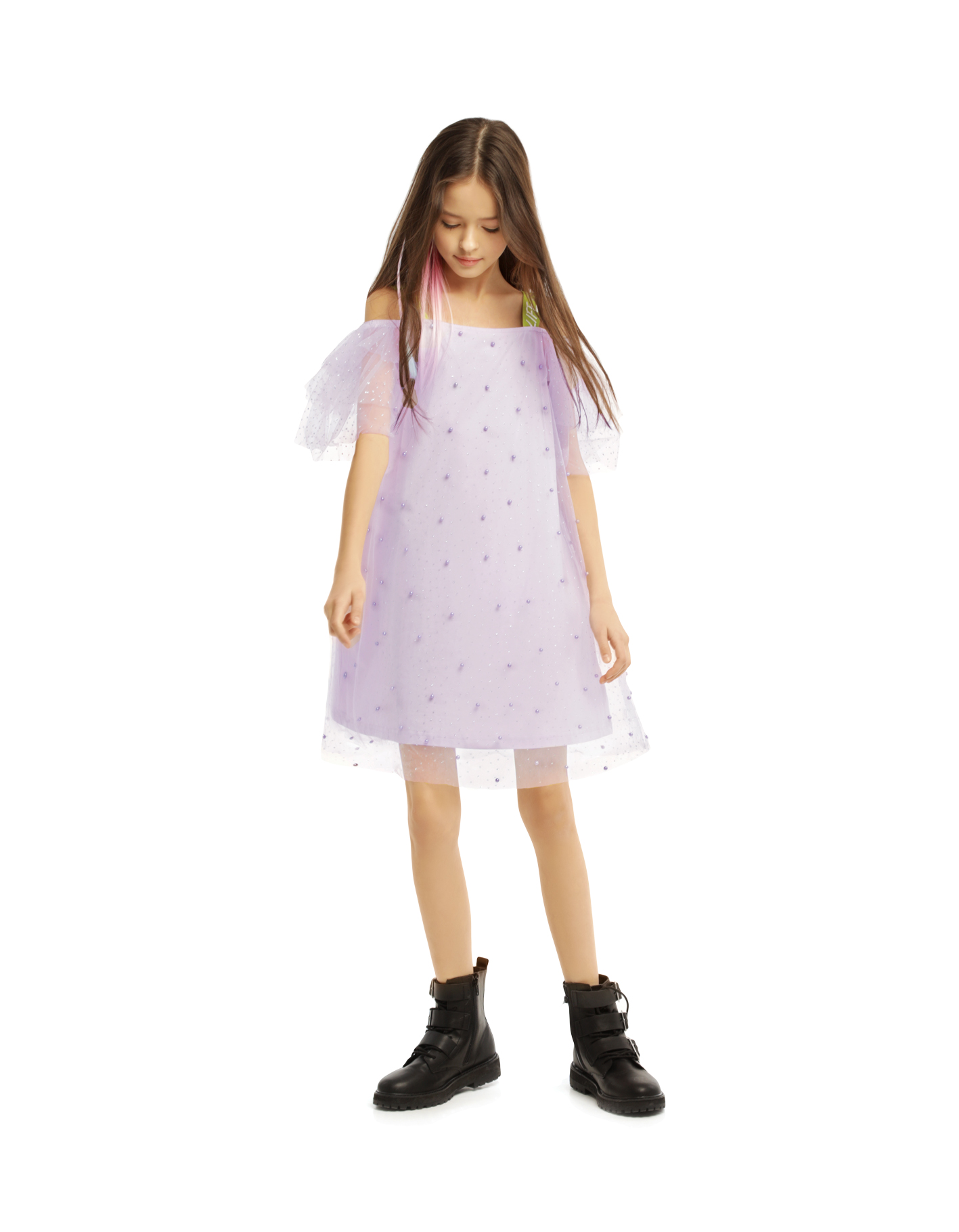 Светло-сиреневое платье для девочки. Отделка сетчатым полотном с использованием мягкого нейлона и страз. Рукава с оборками, шлейки. Дизайнерское оформление в стилистике капсулы "Event".