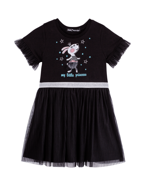 Клетчатое платье трапециевидного силуэта. Полупрозрачные объемные рукава и настрочные рюши. Трикотажная горловина и манжеты, декорированные печатью. Металлические стразы. Принты в стилистике капсулы "Event".