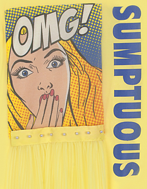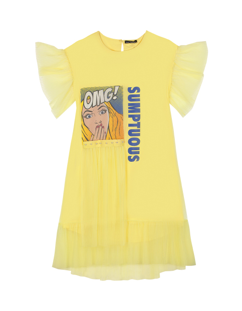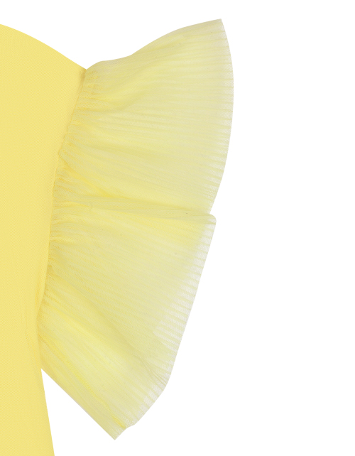 Светло-желтое платье для девочки трапециевидного силуэта ниже колена. Рукава-крылышки, нашивка из репсовой ленты с жемчугом. Дизайнерское оформление в стилистике капсулы "Event".