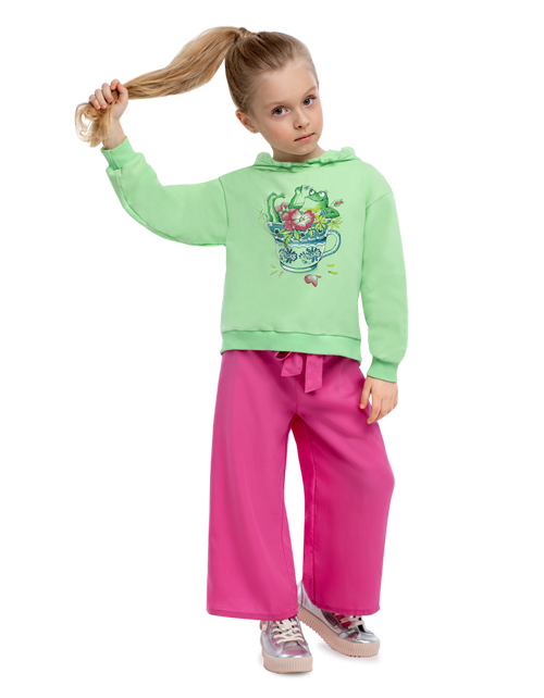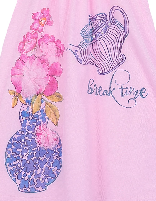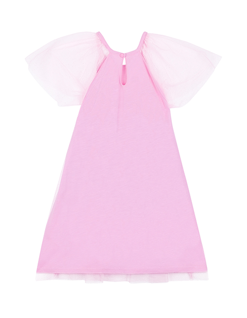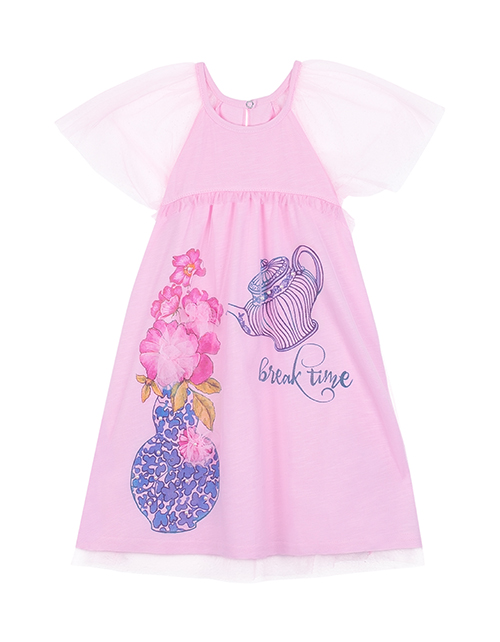 Светло-розовое платье для девочки А-образного силуэта с рукавом "крыло" из прозрачного сетчатого полотна. Нашивки, принты и декор в стилистике капсулы "Чаепитие в саду".