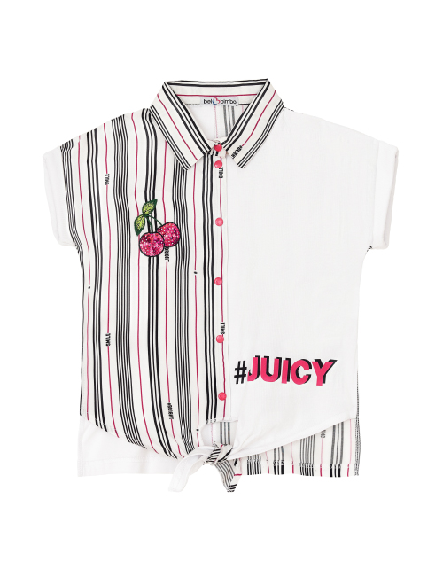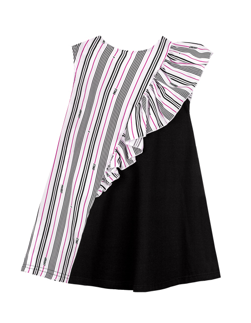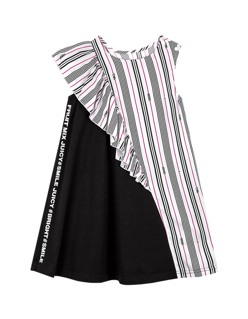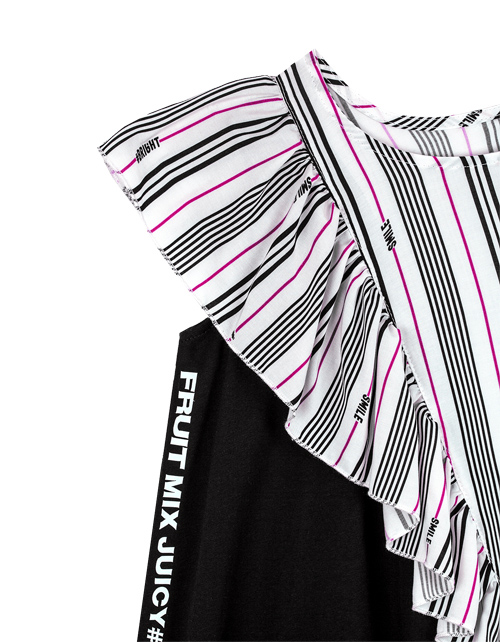 Платье для девочки в полоску А-образного силуэта. Ассиметричная конструкция с воланом из подреза на одно плечо. Застежка на книпперы. Дизайнерское оформление в стилистике капсулы "Фруктовый микс".