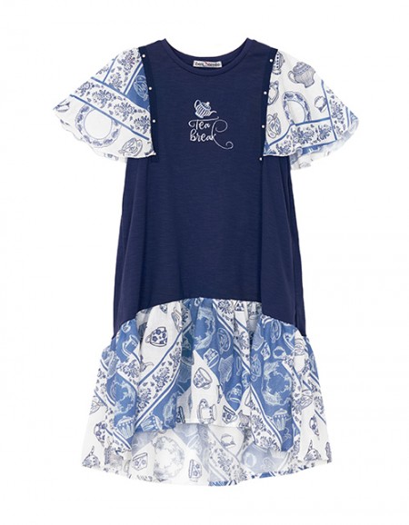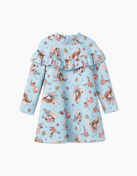 Коралловое платье для девочки. Удлиненная модель трапециевидного силуэта. Застежка на пуговицу на спинке. Декорировано нашивками, сеточкой и пайетками. Оформление в стилистике капсулы "Цветочное сафари".
