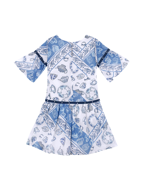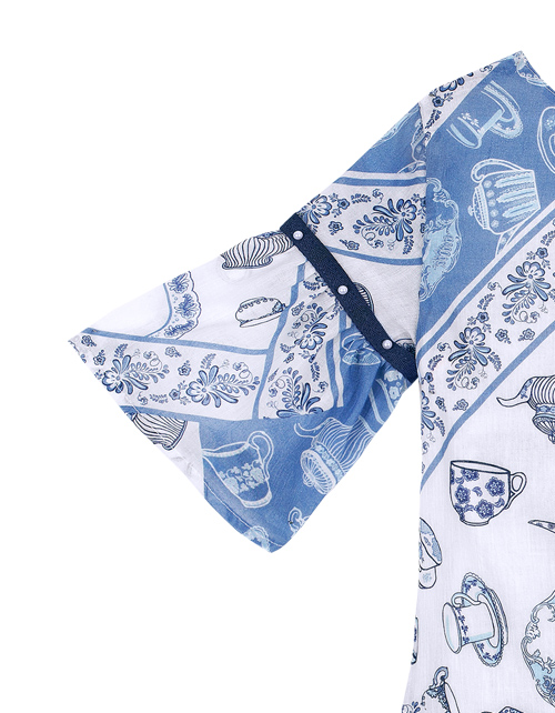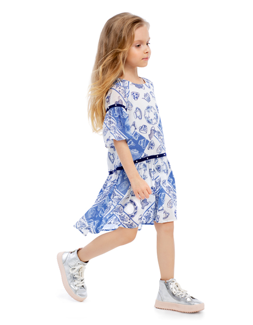 Набивное платье для девочки А-образного силуэта. Рукав с оборкой. Декор в виде киперной тесьмы и бусин "жемчуг". Оформление в стилистике капсулы "Чаепитие в саду".