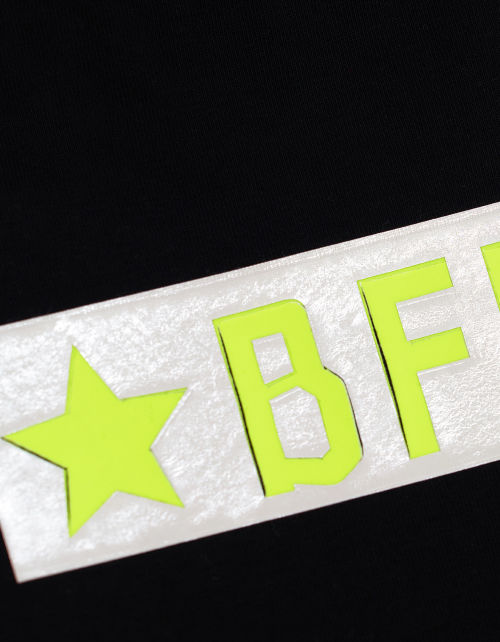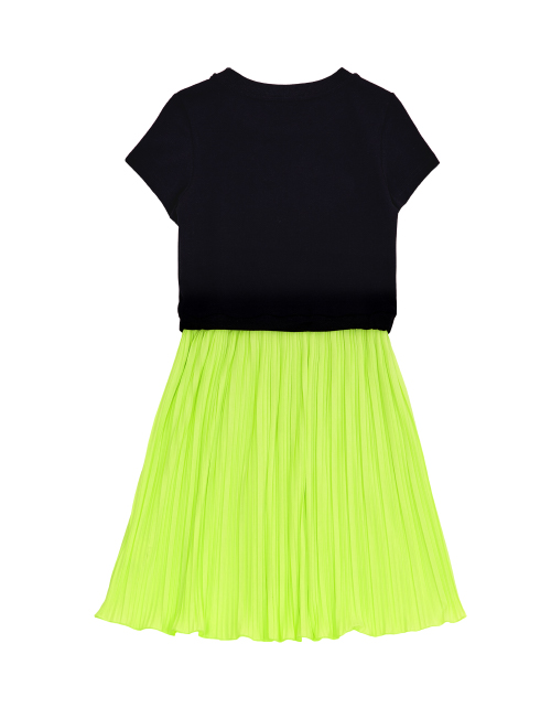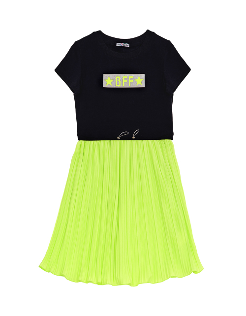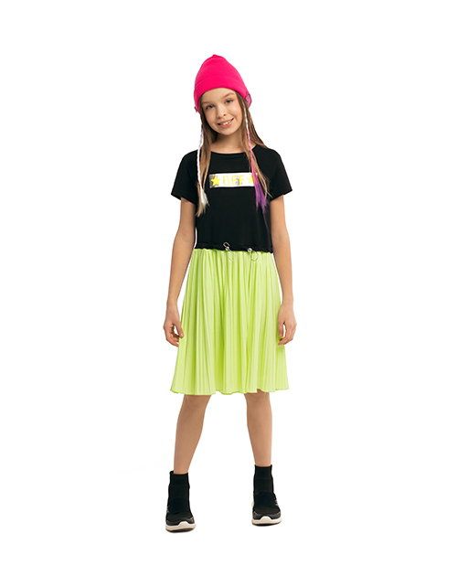 Платье для девочки с коротким рукавом и круглым вырезом горловины. Верх черного цвета с принтом в стилистике капсулы "Кот-Арт". Плиссированная юбка лимонного цвета.