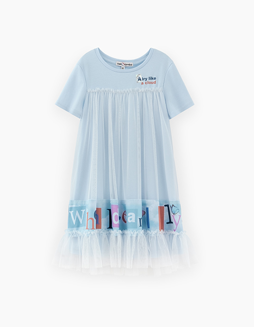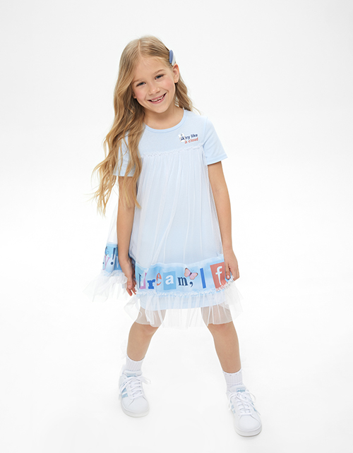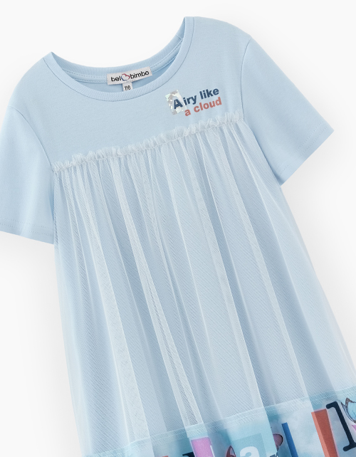 Лёгкое голубое платье для девочки. Нарядно-повседневная модель трапециевидного силуэта со спущенной линией плеча. Изделие из кулирной глади и сетчатого полотна, за счёт чего идёт игра цвета на полутонах.