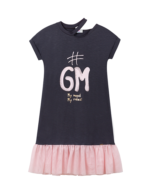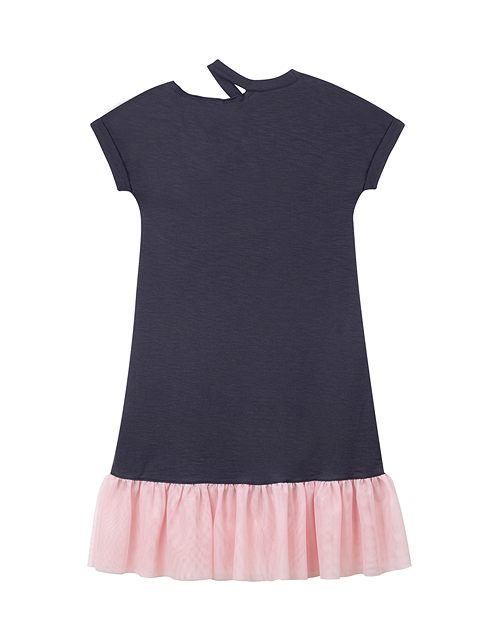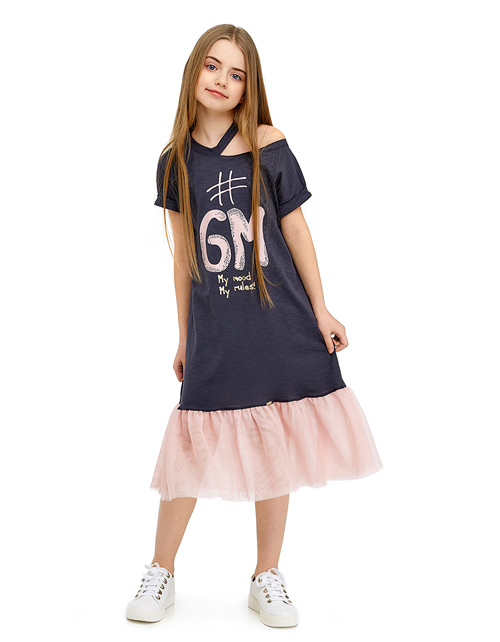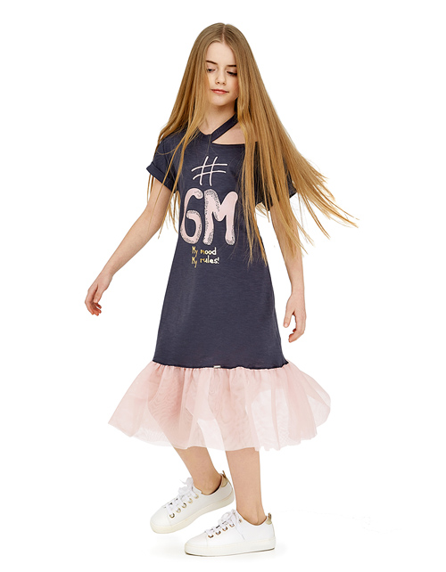 Стильное платье А-силуэта смотрится особенно актуально благодаря контрастному сочетанию комфортной натуральной ткани и ультрамодной сетчатой фактуры, использованной в декоре низа изделия. Особый шик придают оригинальный дизайн верха и сияющий принт