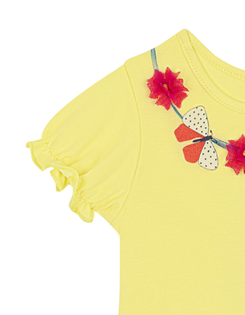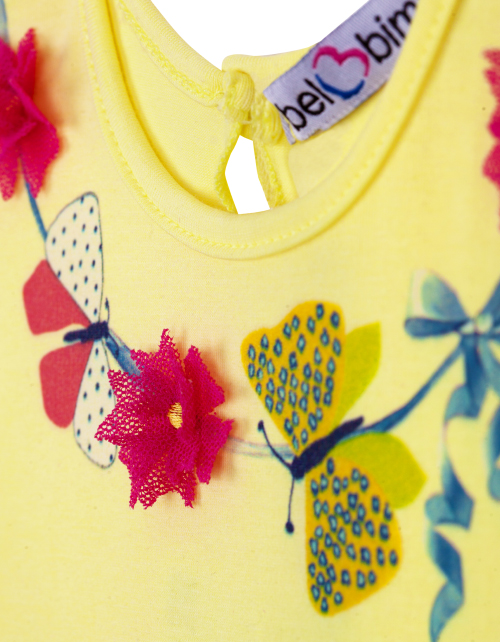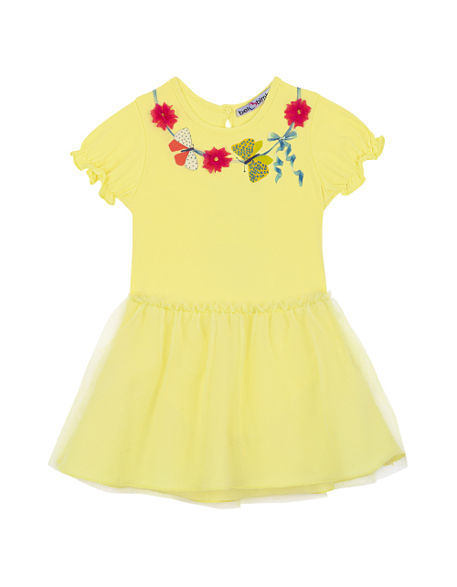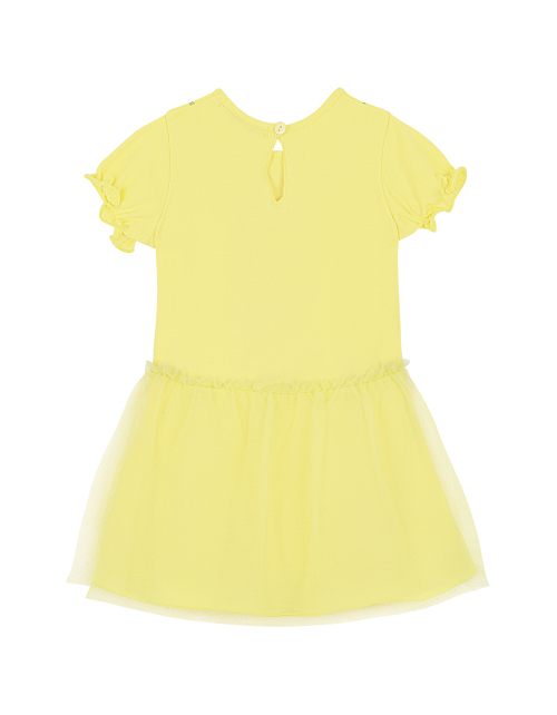 Платье-боди с коротким рукавом, декорированным оборками. Лицевая сторона декорировано вставками и принтами. Юбка модели украшена сетчатым полотном. На спинке присутствует застёжка на пуговице в тон платья.