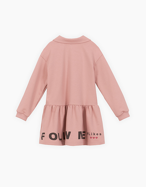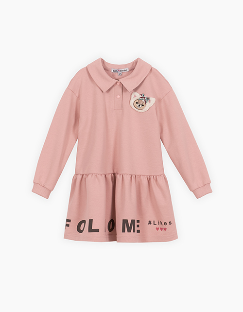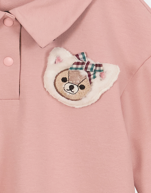 Платье с длинным рукавом нежного оттенка хрустальная роза. Модель с застёжкой поло на кнопках, обработанная материалом в клетку. Изделие из приятного и бархатистого футера. Платье декорировано объёмной крафтовой вышивкой - мишкой - в виде броши.