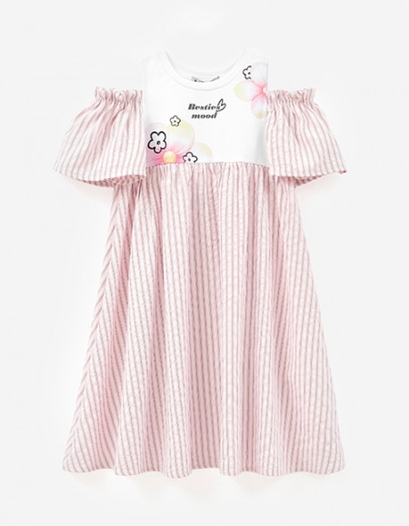 Платье, имитирующее комплект из футболки и сарафана, для девочки. Модель комфортного летящего А-образного силуэта. Спущенная линия плеча. Эластичная горловина. Платье выполнено из мягкой сетки и кулирной глади с авторским принтом. Декорировано стразами.