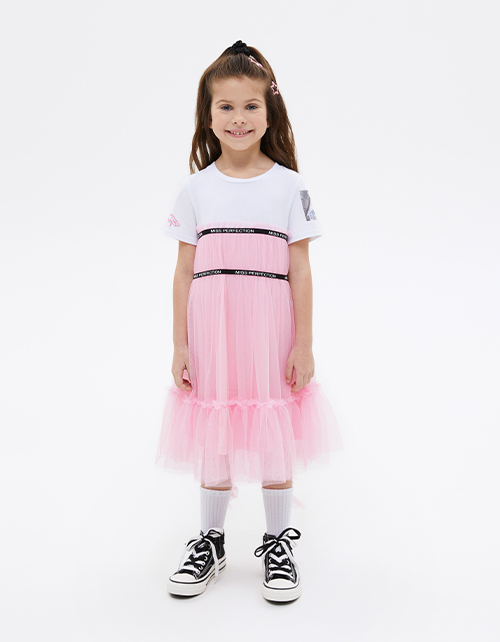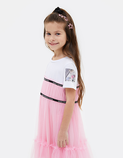 Платье нежного оттенка помадный розовый для девочки. Модель комфортного трапециевидного силуэта. Комбинация материалов: кулирная гладь и сетчатое полотно. Платье декорировано авторским принтом и декоративной чёрной эластичной лентой с надписью.
