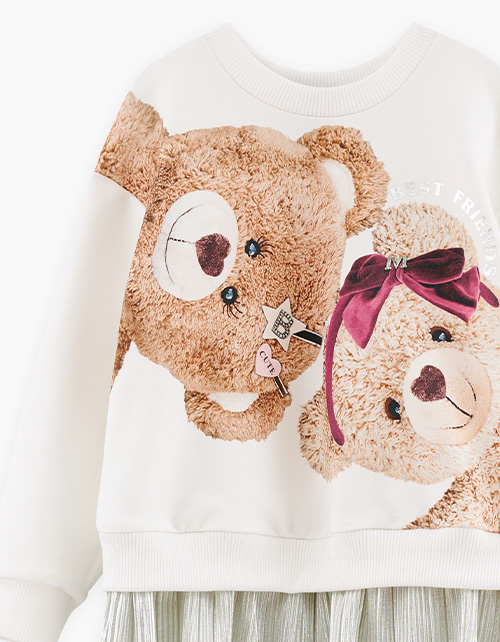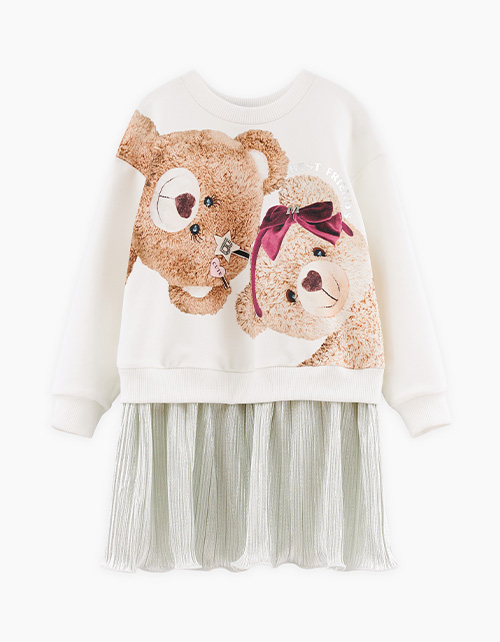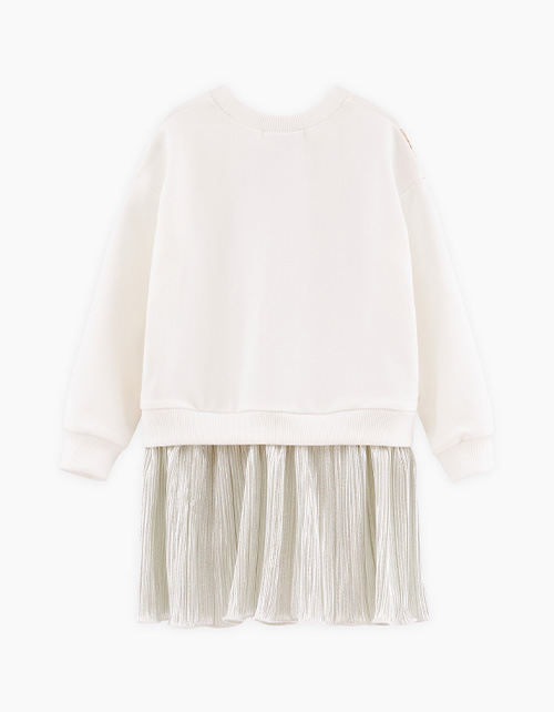 Милое платье для девочки. Модель прямого силуэта. Имитация комплекта из свитшота из футера и плиссированной юбки. Воротник, манжеты и низ свитшота из эластичной рибаны. Платье декорировано авторским принтом и стразами.