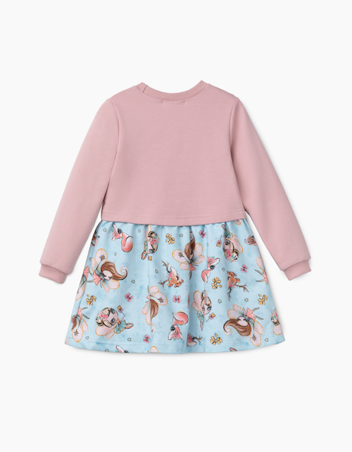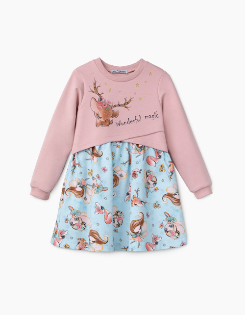 Платье полуприлегающего силуэта. Выполнено из комбинации однотонного футера с принтом и набивного футера. Отделка рибаной по горловине и низу рукава. Декорировано золотыми стразами