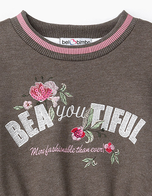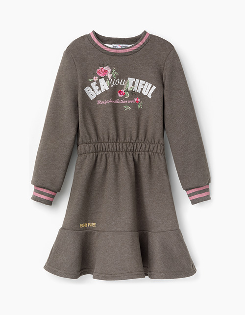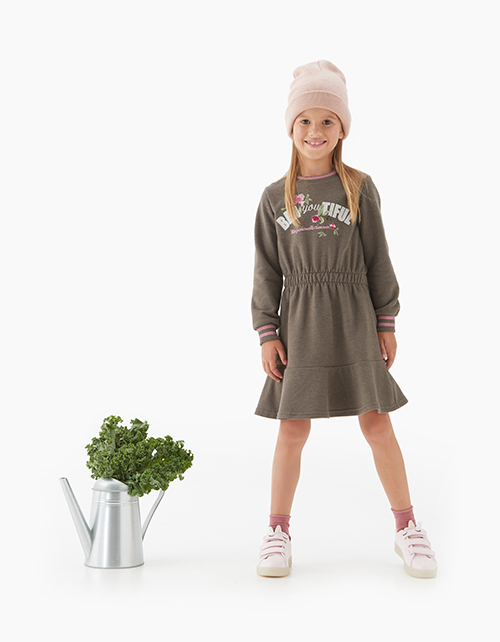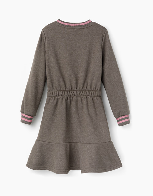Платье спортивного силуэта с резинкой по талии и воланом по низу. Выполнено из меланжевого футера цвета хаки. Горловина и манжеты - из рибаны с розовой полосой. Модель украшена вышивкой с пайетками в стилистике капсулы.