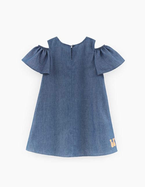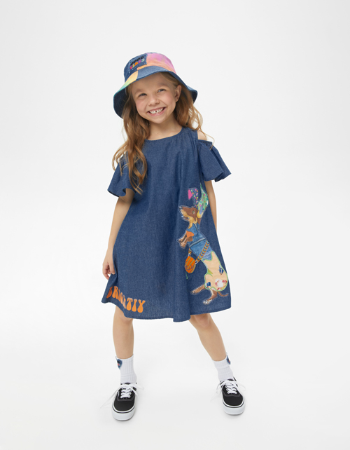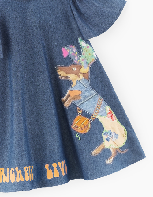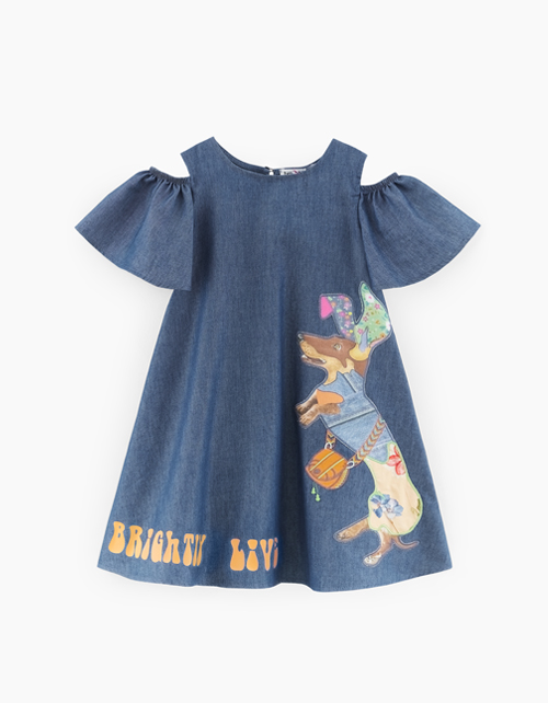 Модное платье в оттенке деним для девочки. Модель комфортного А-образного силуэта. Изделие с открытыми плечами и воланами по рукавам. Платье декорировано дизайнерской аппликацией - собакой в стиле хиппи.