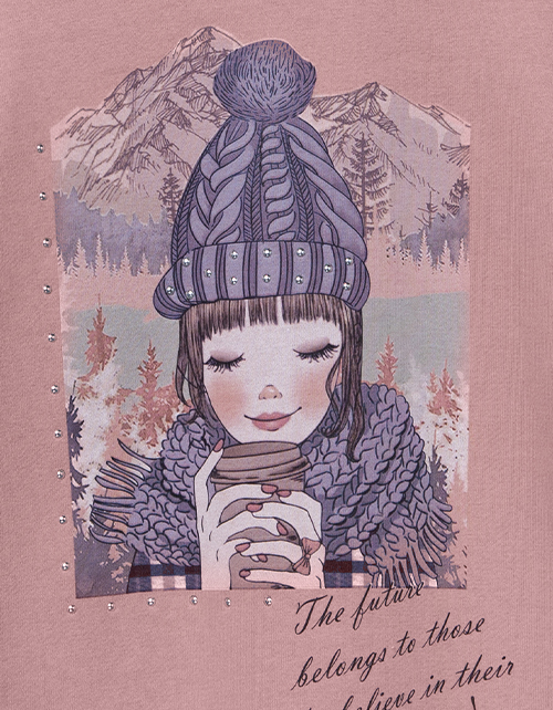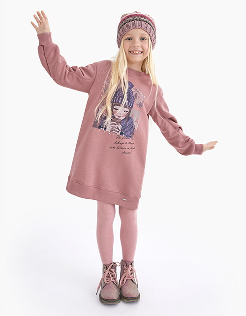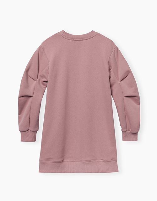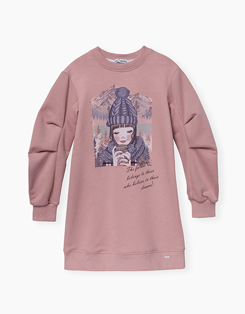 Уютное трикотажное платье прямого свободного кроя из плотного розового футера с отделкой из рибаны по нижнему краю, горловине и рукавам. Украшено авторским принтом в пастельных тонах и стразами. Объемные рукава со складками делают силуэт оригинальным.