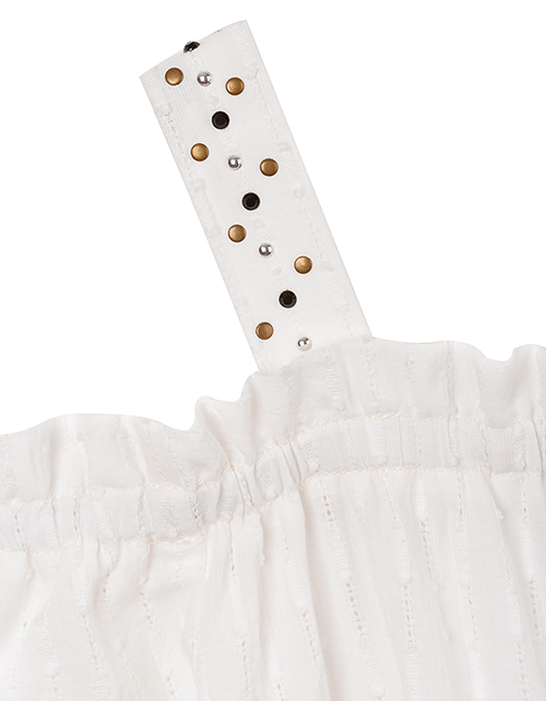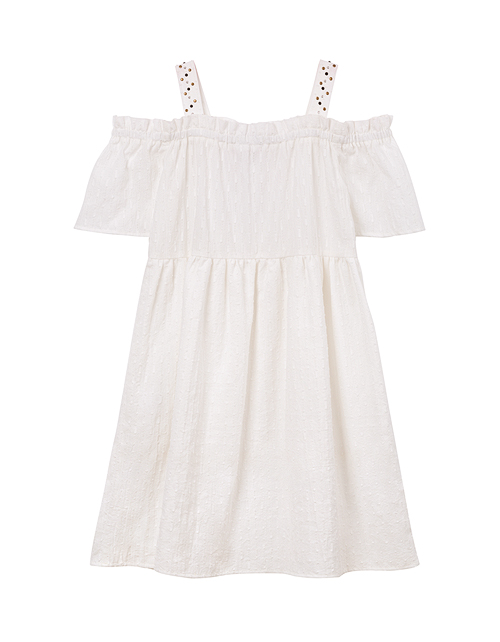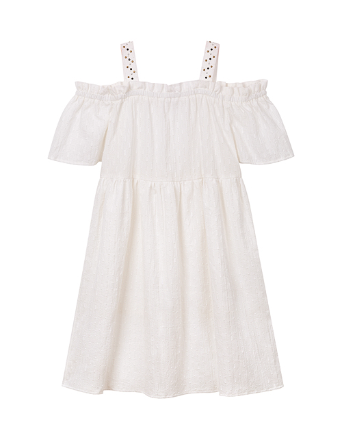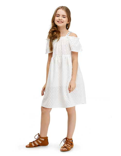 Нежное платье из фактурного хлопка - незаменимая вещь в летнем гардеробе. Модная форма, романтичные оборки, открытые плечи, бретели, декорированные фурнитурой, создают стильный и лёгкий образ. В этом платье девочка будет чувствовать себя комфортно и утонч