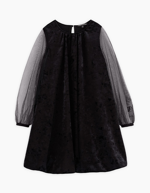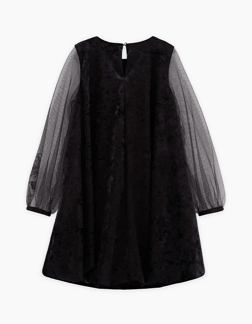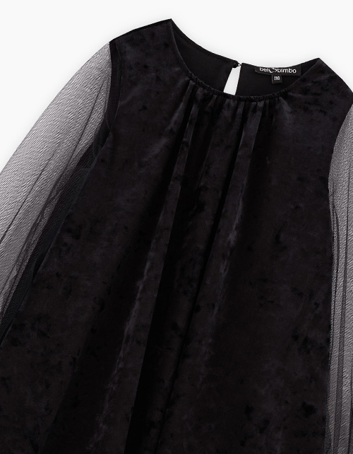 Стильное бархатное чёрное платье для девочки. Модель комфортного О-образного силуэт. Застёжка на пуговицу. Комбинация материалов: трикотажное полотно и рукава из мягкого сетчатого полотна. Рукава декорированы авторской трансферной печатью и стразами.