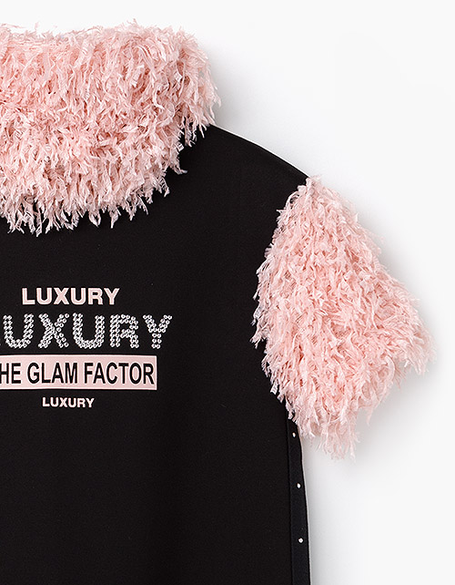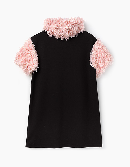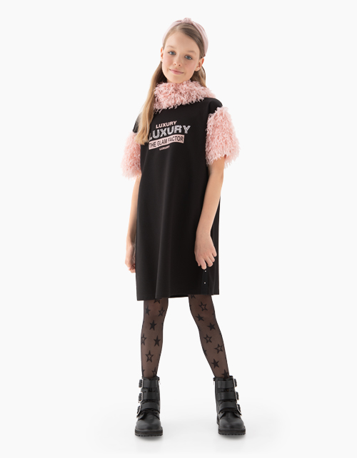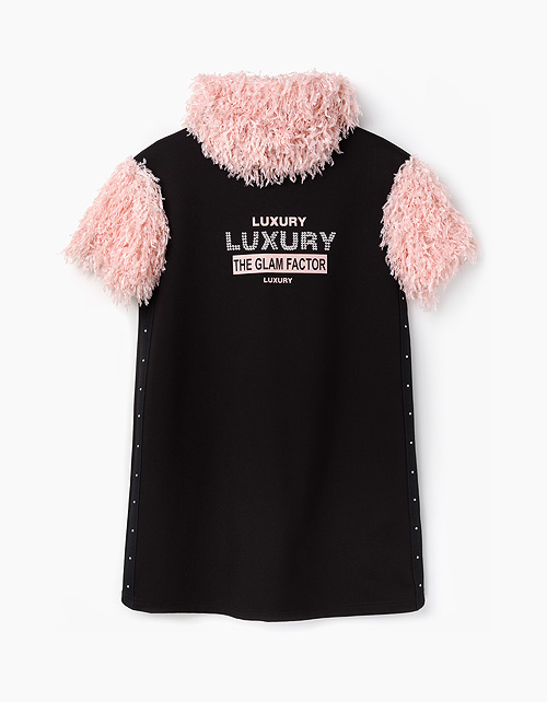 Эффектное платье А-силуэта с короткими рукавами и воротником-хомутом из трикотажа, имитирующего перья. Украшено принтом по центру из слов Luxury ("Роскошь"), the glam factor ("гламурный фактор"). Стразы по боковым швам