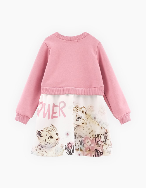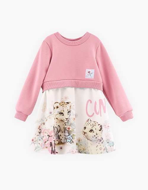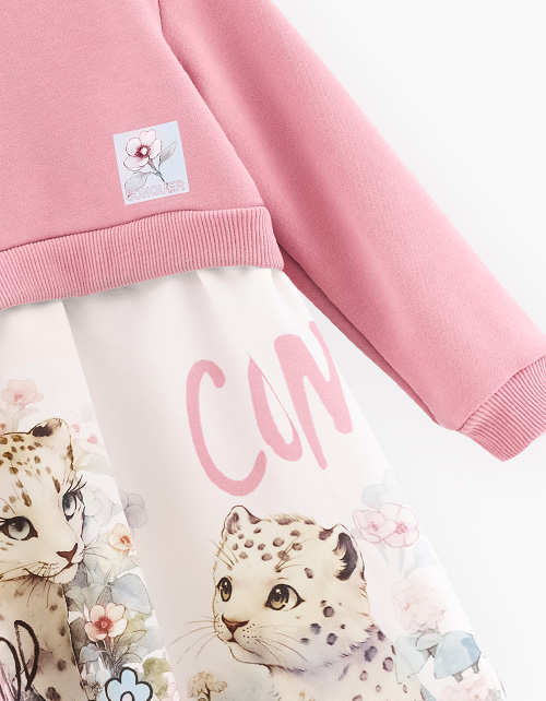Модель с эффектом комплекта: нежно-розового тактильно приятного свитшота и юбки молочного оттенка с авторскими принтами. Комфортный А-образный силуэт. Горловина, манжеты и низ "свитшота" из эластичной рибаны. Декор: DTF печать, стразы.