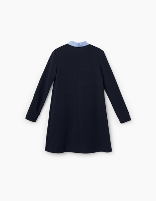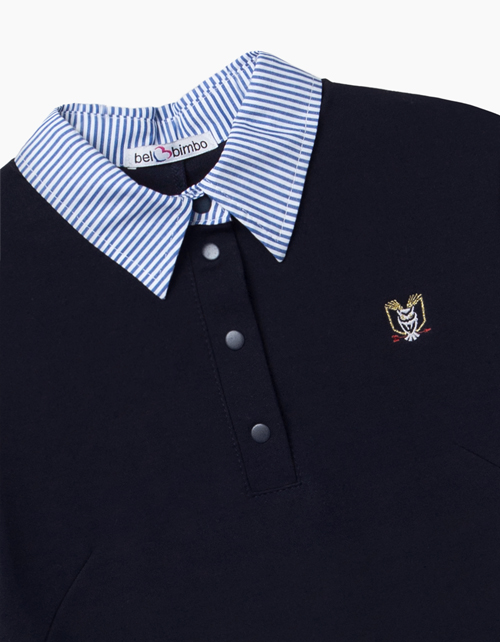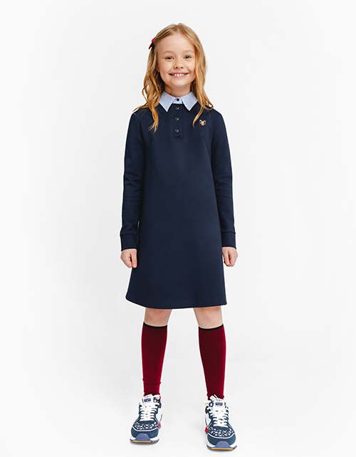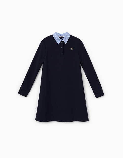 Платье поло А-силуэта из приятного на ощупь трикотажного полотна темно-синего цвета. Модель декорирована застежкой на книпперы контрастного цвета, отложным воротником из сорочечной ткани в тонкую бело-голубую полоску, фирменной эмблемой коллекции