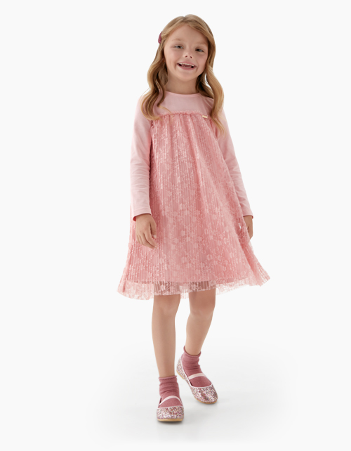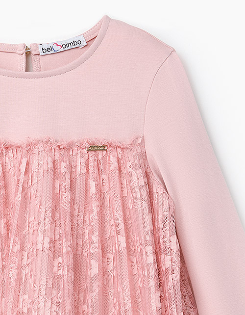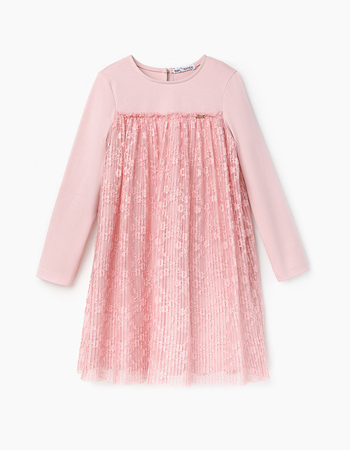 Трикотажное платье А-силуэта с длинным рукавом. Украшено слоем плиссированного кружева в тон основной ткани и декоративной нашивкой из золотистого металла с надписью fashion. Удобная застежка на пуговицу сзади.