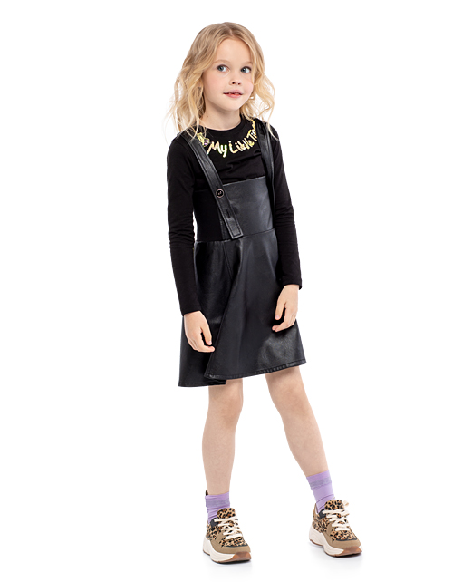 Сарафан для девочки из кожи имеет приталенный силуэт и стильный дизайн. Изделие с отрезной линией талии дополнено перекрещивающимися на спине лямками и вставками из вискозы. Подкладка обеспечивает дополнительный комфорт.