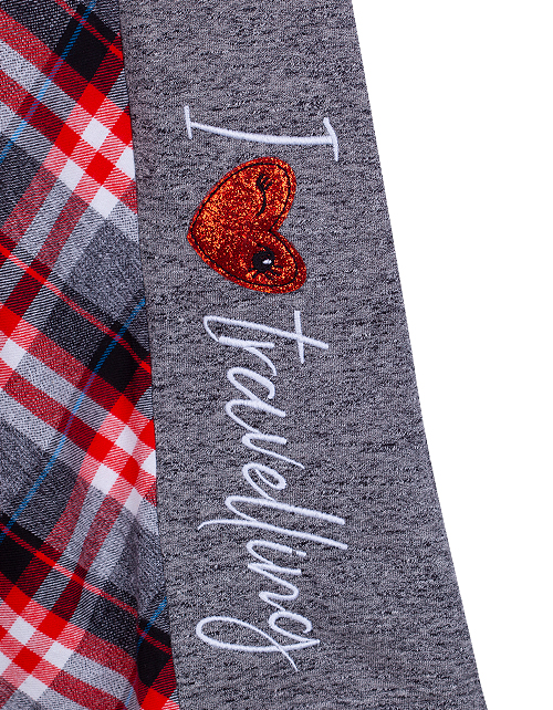 Сарафан для девочки в клетку без рукавов дополнено застежкой на пуговицы на плече и стильным принтом в виде надписи с вышивкой. Изделие а-силуэта с круглым вырезом горловины пошито из тканей двух видов: футера и фланели.