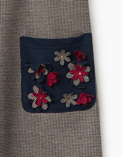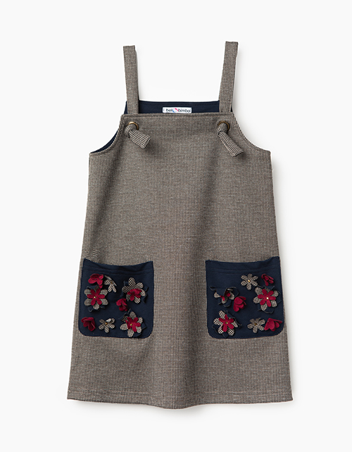 Трикотажный сарафан А-силуэта из имитации клетчатой костюмной ткани. Длина бретелей регулируется узлом. Накладные карманы из имитации джинсовой ткани украшены отлетными элементами в виде цветочков со стразами.