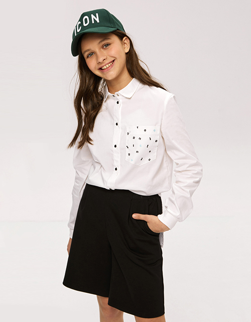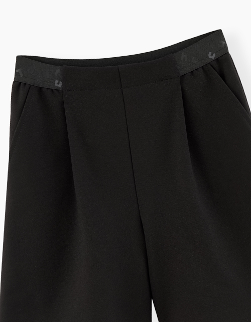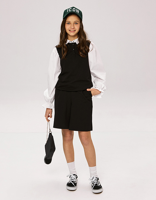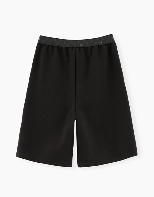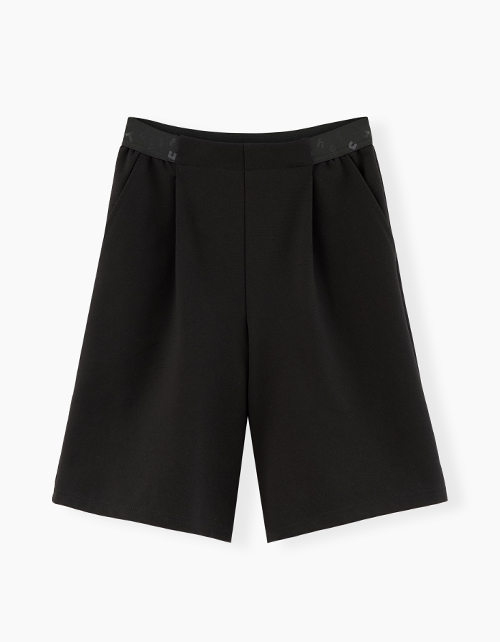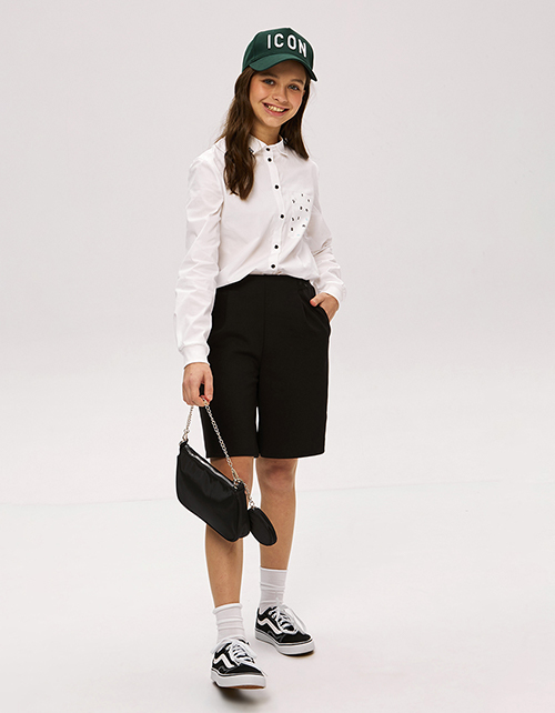 Хит школьной коллекции - черные шорты-бермуды для девочки. Стильная модель на эластичном поясе с наклонными боковыми карманами. Декорированы эластичной лентой с тематическим принтом.