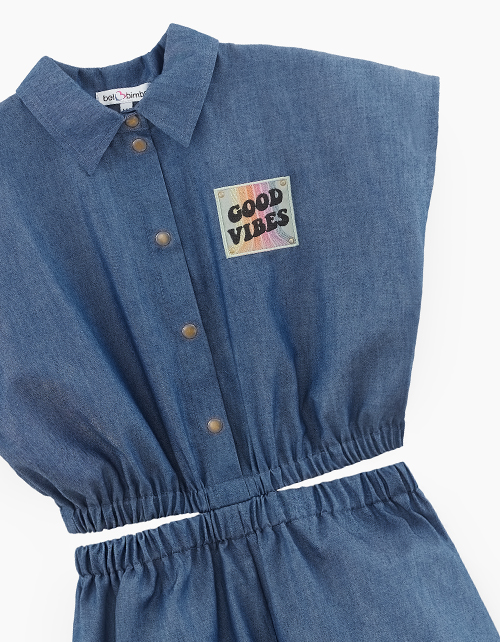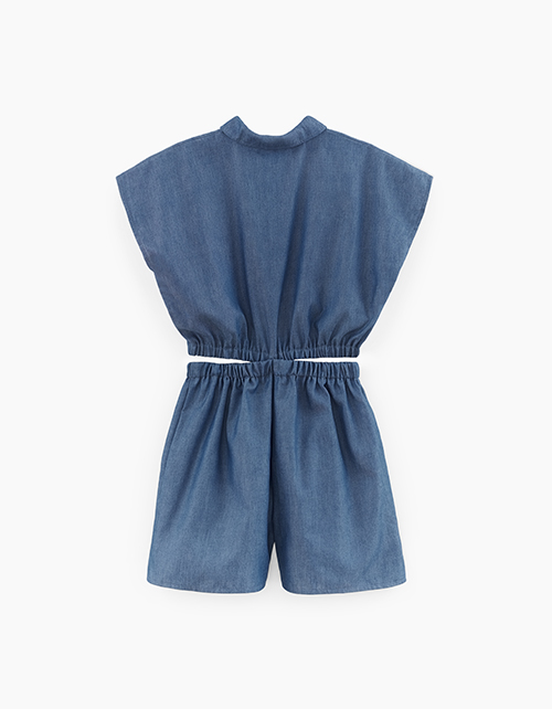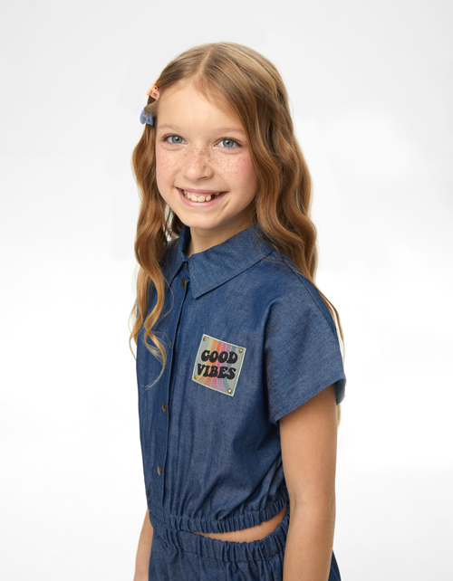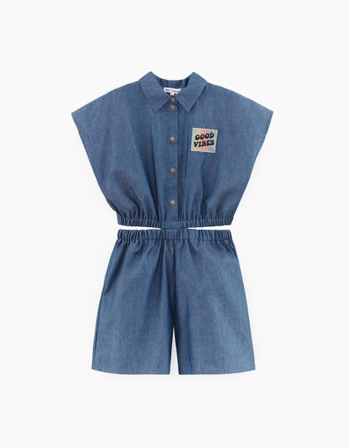 Оригинальный комбинезон в оттенке деним для девочки. Модель прямого расслабленного силуэта. Изделие с разрезом по спинке. Комбинезон декорирован нашивкой и стразами под латунь. Модель с комфортной застёжкой на кнопки.
