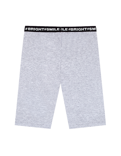 Шорты для девочки цвета светло-серый меланж. Черная резинка на поясе. Принты-надписи в стилистики капсулы "Фруктовый микс".