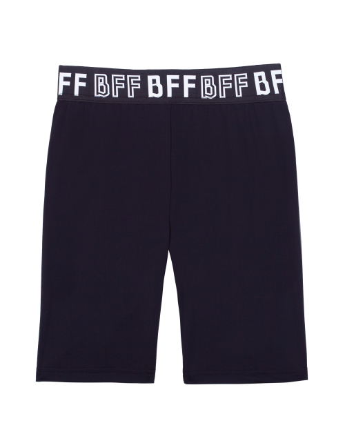 Черные шорты для девочки прилегающего силуэта длиной до середины бедра на мягком поясе из эластичной ленты. Принт-надпись в стилистике капсулы "Кот-арт".
