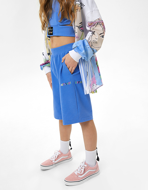 Шорты яркого лазурного оттенка для девочки. Удлинённая модель прямого расслабленного силуэта со средней посадкой. Шорты из футера с браш-эффектом. Комфортное изделие на мягком поясе. Модель декорирована вышивкой.
