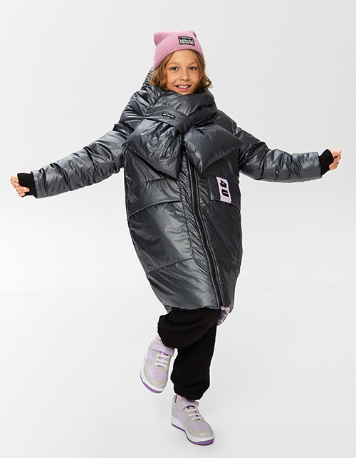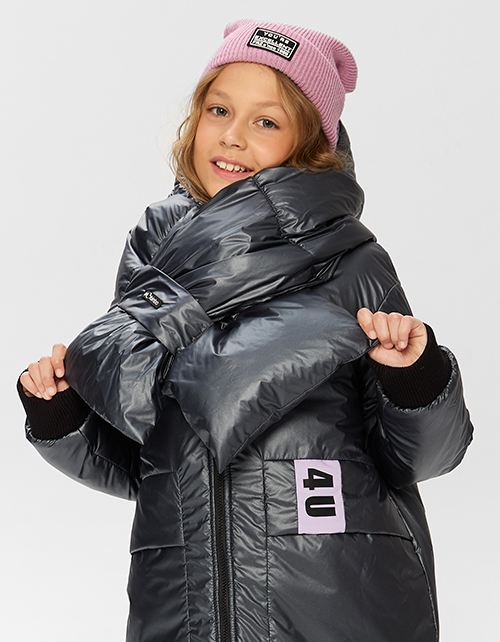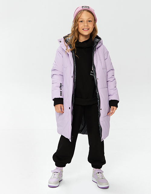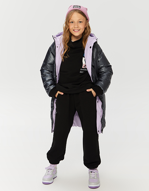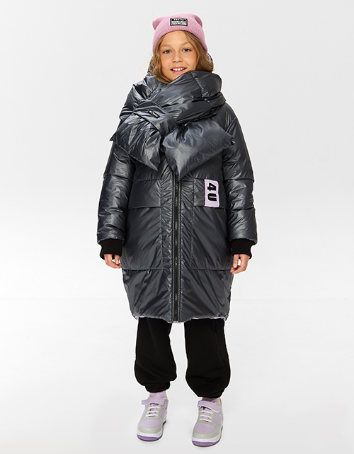 Стильная зимняя двусторонняя куртка с модным аксессуаром - лимитированным шарфоом. Модель лилового цвета трансформируется в черный повседневный вариант. Куртка с наклонными боковыми карманами выполнена из ткани с матовым покрытием.