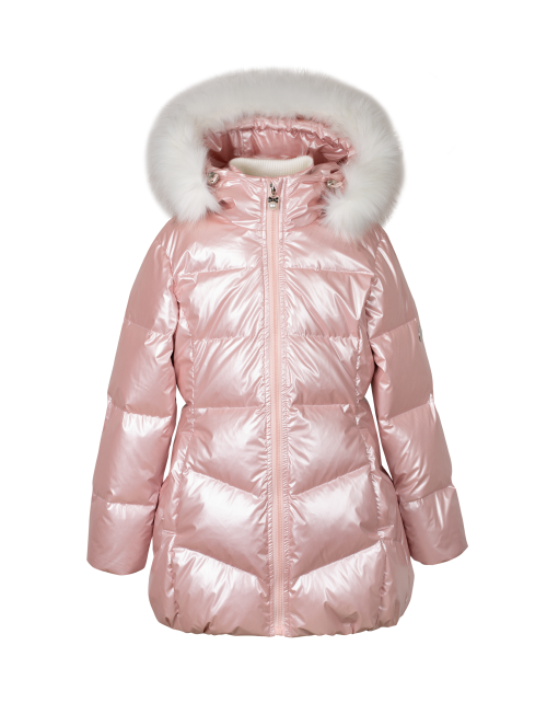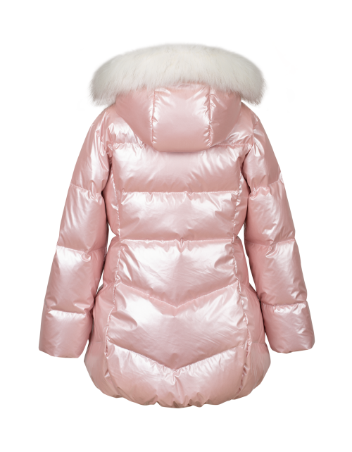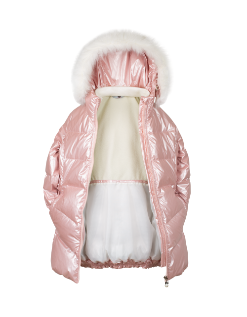 Куртка для девочки на пуху приталенного силуэта дополнена застежкой молнией, капюшоном с мехом и высоким воротником. Ткань плащевая дьюспо с жемчужным покрытием не пропускает влагу, а подкладка из флиса и нейлона гарантирует комфорт в носке.