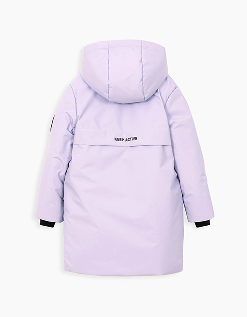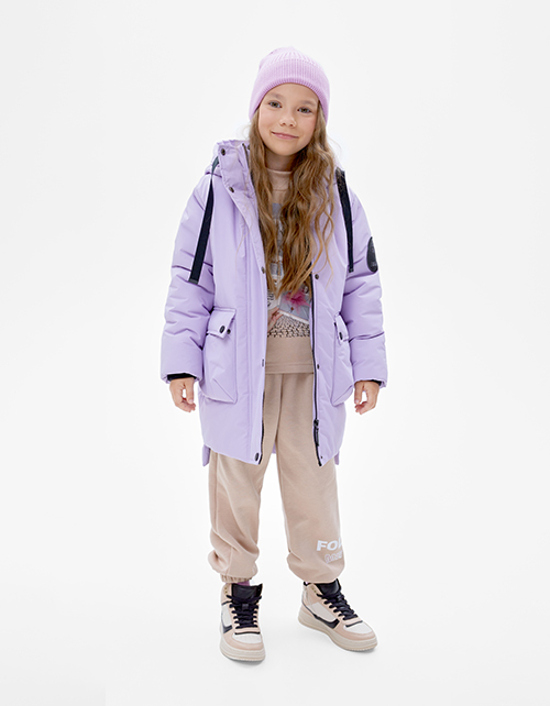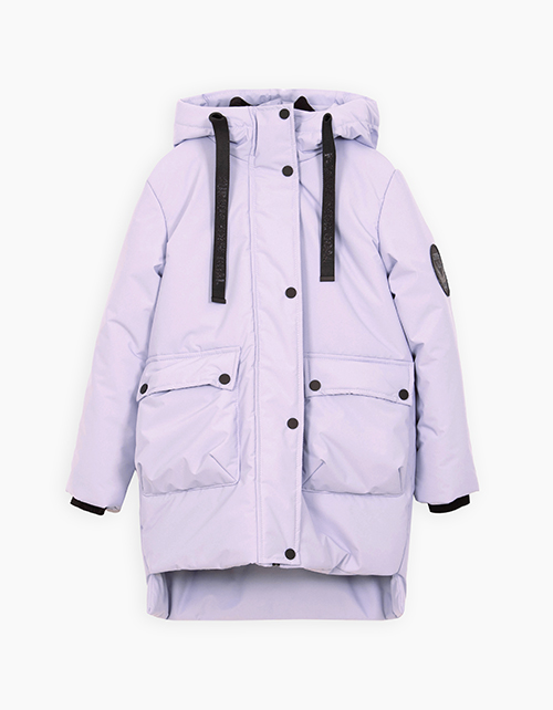 Зимняя куртка с удлинённой спинкой лилового оттенка. Модель на молнии, закрытой ветрозащитной планкой на кнопки. Мягкие трикотажные манжеты по внутреннему воротнику и рукавам. Комбинированная подкладка из флиса и нейлона. Нашивка и ленты в виде декора.