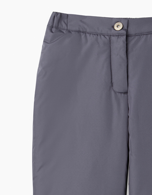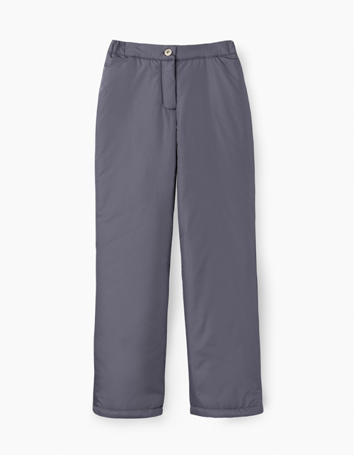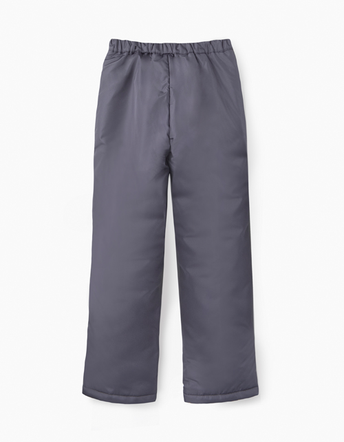 Теплые подростковые брюки из плащевой ткани серого цвета. На узком поясе с резинкой. Надежная застежка на молнию и болт спереди по центру. Свободный прямой крой